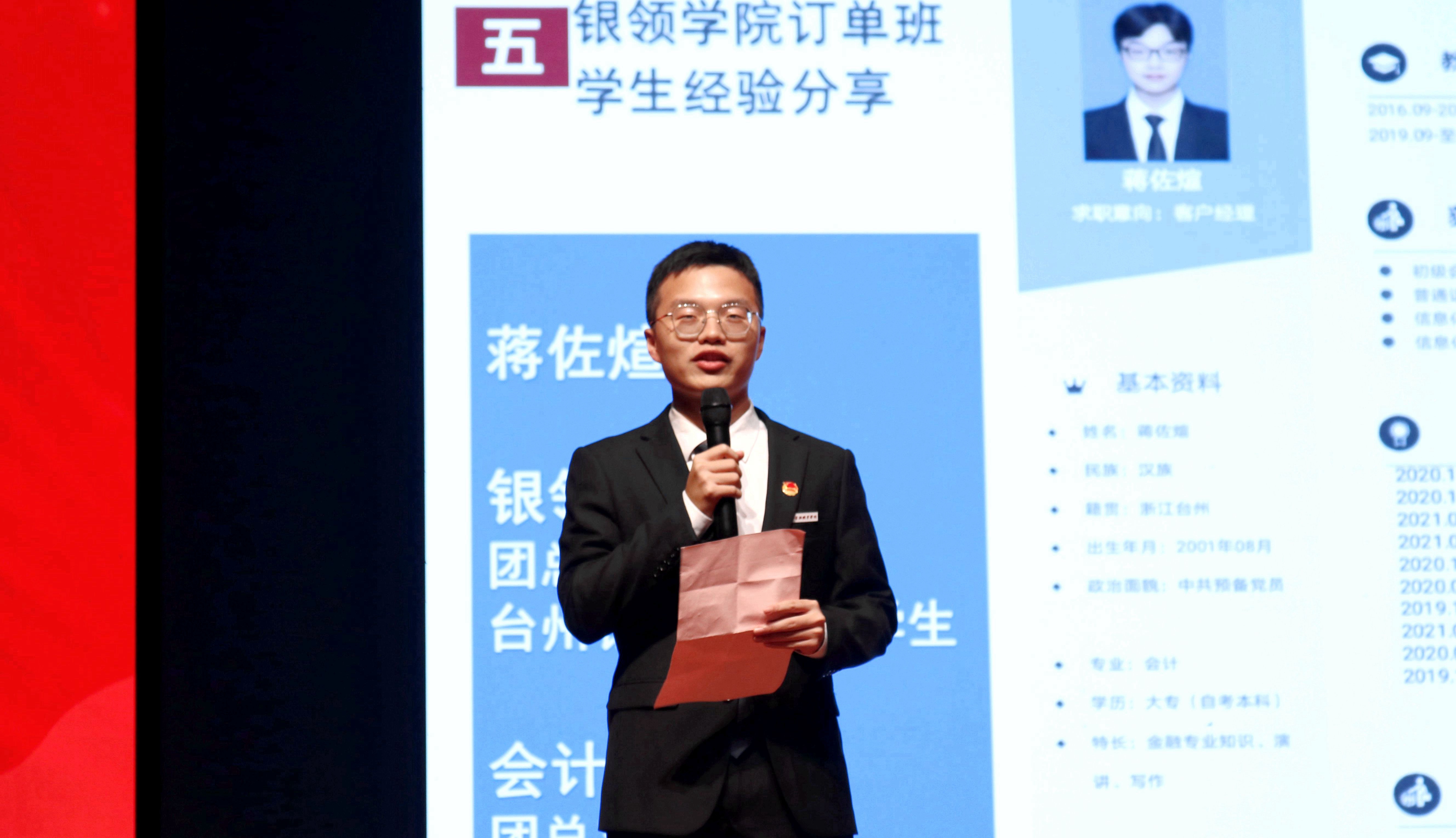 讲座最后,会计学院团总支副书记、台州银行订单班优秀学生代表蒋佐煊结合自身经历向大家分享了自己大学三年的学习经验,他强调天道酬勤之重要,并以名言相赠。