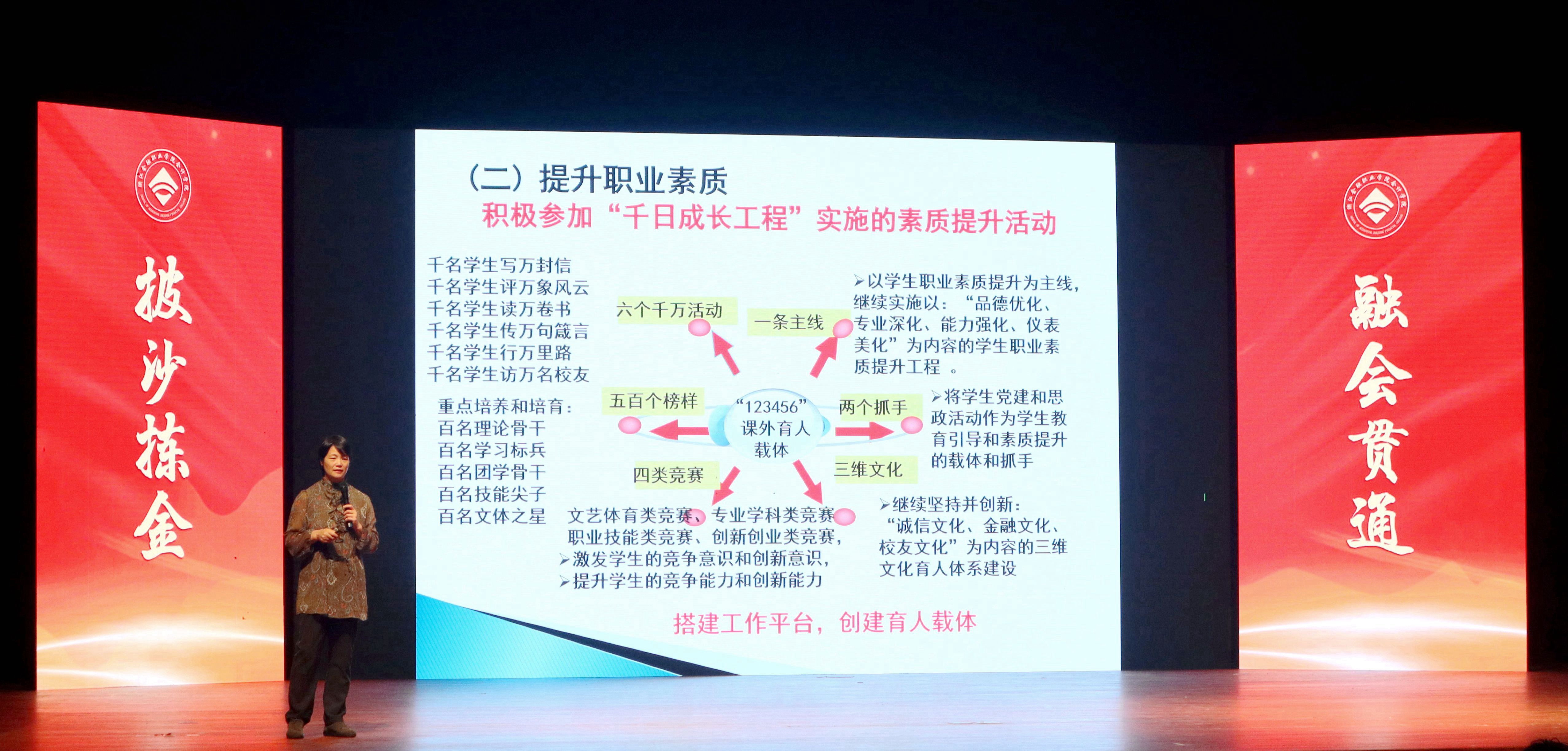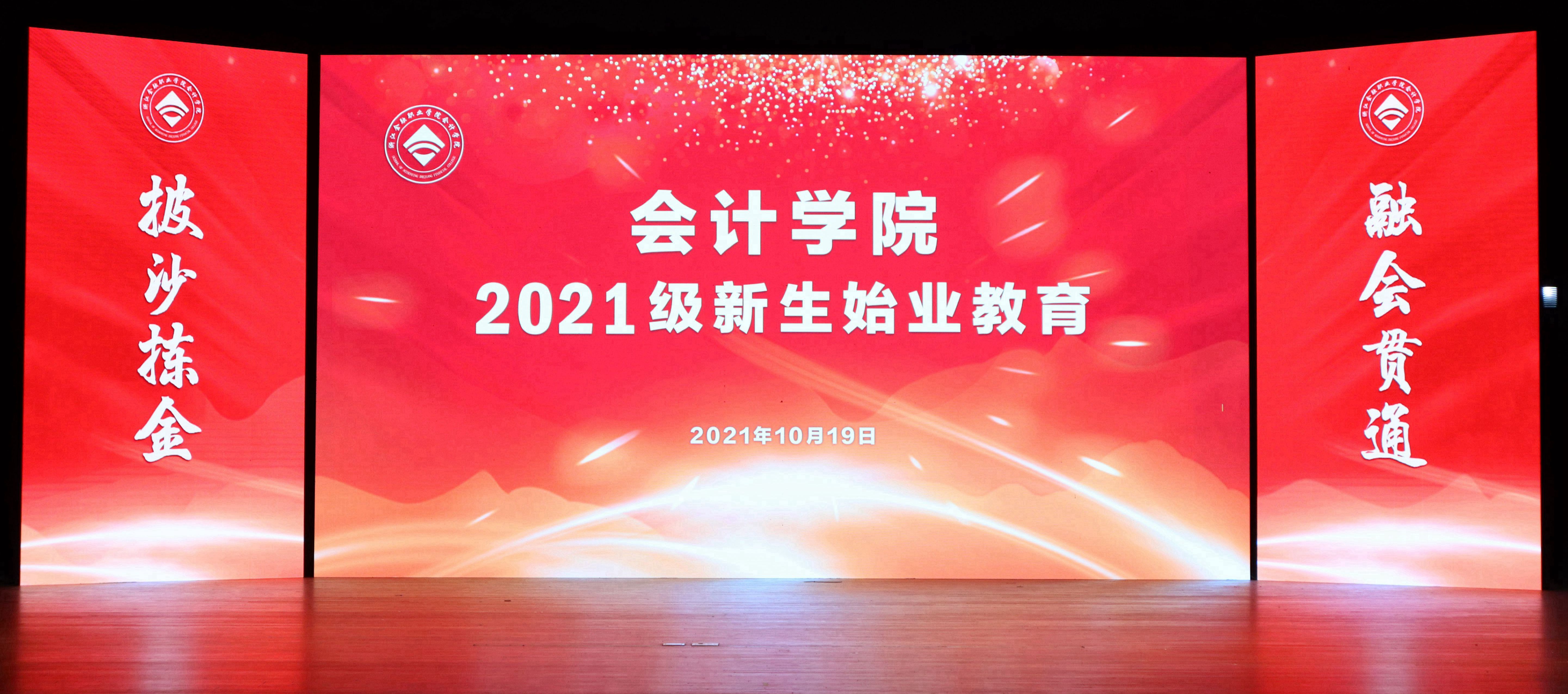 2021年10月19日晚上,会计学院在金葵花艺术中心召开了2021级新生始业教育活动。本次始业教育活动由会计学院潘宁老师主持,继续教育学院院长王祝华、淑女学院副院长吴军飞、银领学院副院长邵月花与在场的会计学子分享了有关学历提升、职业发展、道德修养等方面相关信息。