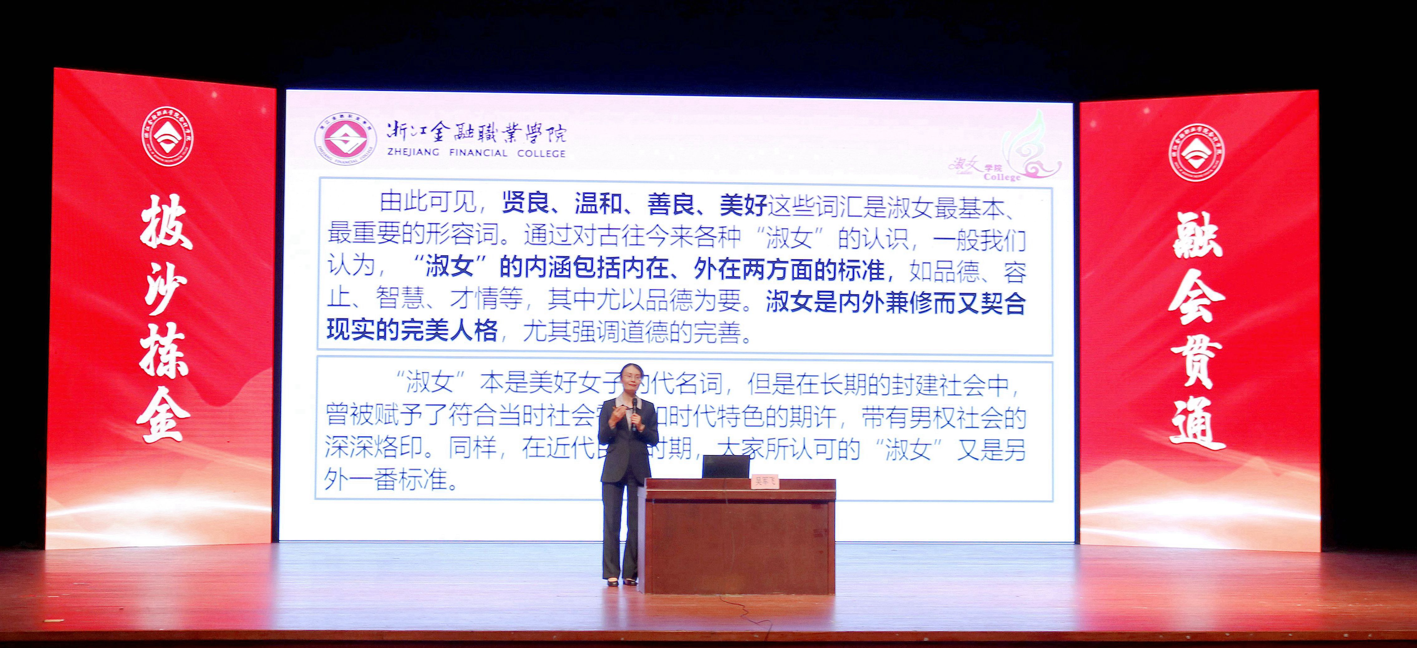 接着,吴军飞老师代表淑女学院为同学们带来一场主题为“魅力职业女性,多彩完美人生”的演讲。演讲之初,她向大家介绍淑女学院创设的原因和“淑女之风”对未来就业的影响,这让大家对淑女学院有了更进一步的了解。她从教学模块内容、四季课程、三个育人课堂、素质教育讲座和文化艺术节等多项活动介绍淑女学学院的情况。最后,她希望大家多多关注淑女学院公众号,积极参加相关课程,一起行动起来修炼“美”。