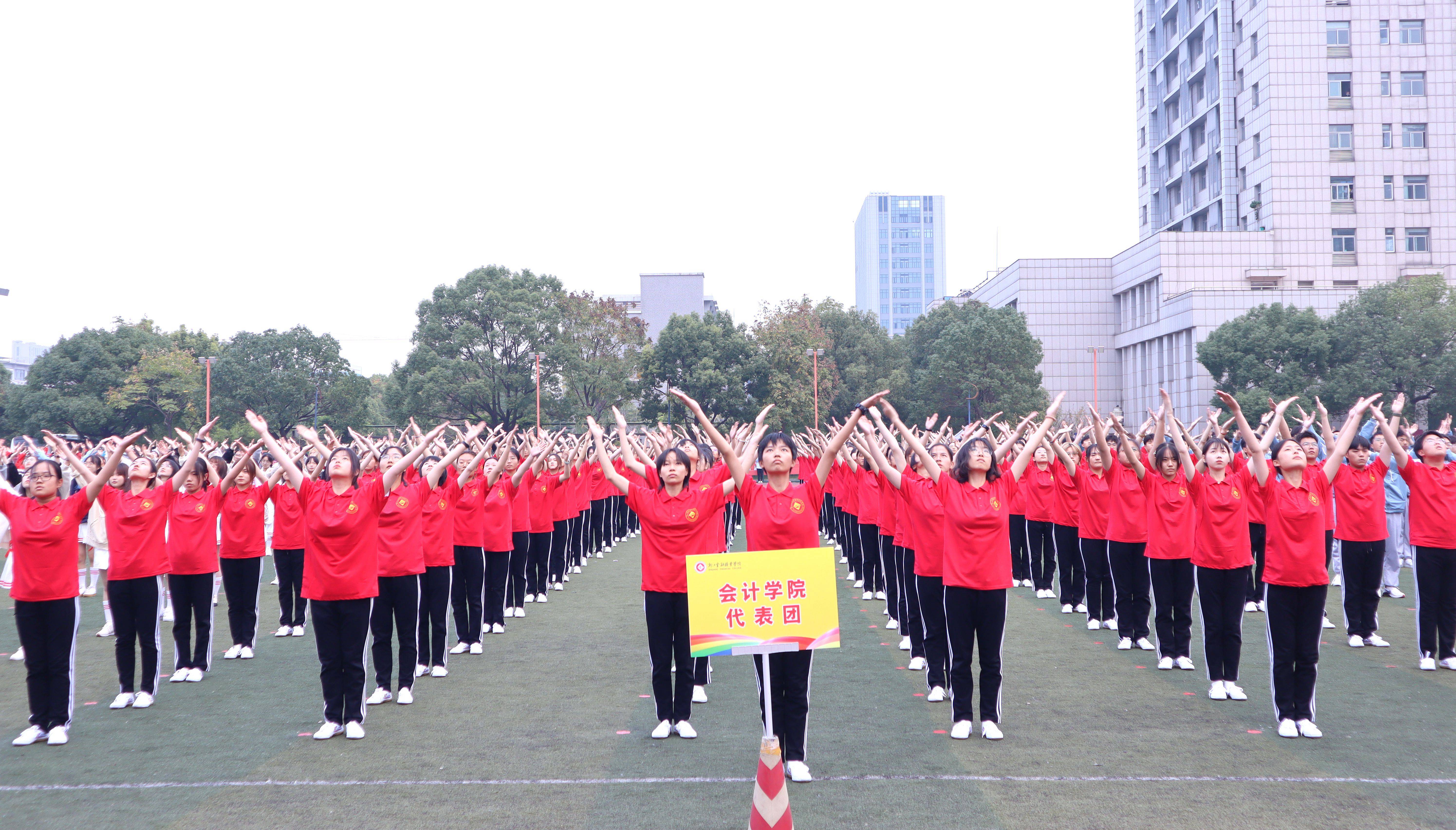 广播操比赛中,会计学子身着红衣,动作干净利落、整齐划一,一招一式都彰显着青春与激情,展现出会计学子的意气风发。
