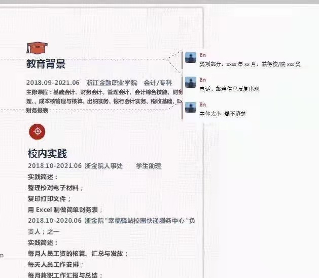 为认真贯彻“就业立校“的办学方针,实现毕业生充分就业、优质就业和顺利就业,根据近期学院召开的毕业生就业工作会议精神,进一步提高同学们的应聘能力,会计学院于10月15日举行第十三届求职简历制作大赛。在此次评比中,各位评委老师们对学生的简历进行了线上批改和评比,确保全体学生都能参与此次大赛并保证了简历的质量。面对此次大赛,同学们踊跃报名,因为这是一个非常难得的学习机会,不仅提前体验了就业招牌的模式,而且对自己的优势于劣势有了更清楚的认识。本次大赛的求职简历由一份自荐书和简历表格组成,指导老师们指出同学们在简历中要突出自己的优势,从多方面来展现自己。