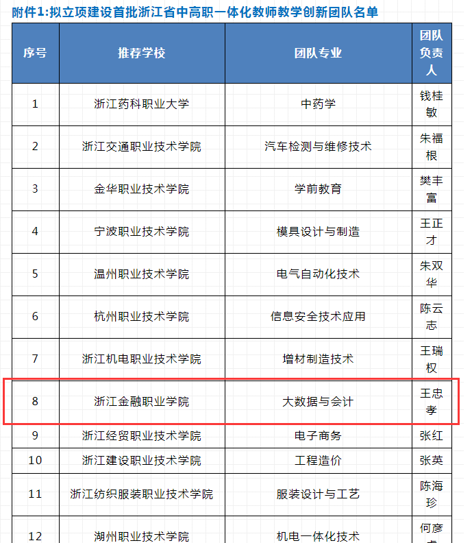 为进一步推进中高职一体化改革、加强浙江省高水平“双师型”职业教育教师队伍建设,浙江省教育厅启动建设中高职一体化教师教学创新团队。经单位推荐、项目汇报、专家遴选,近日浙江省教育厅发布了《关于首批浙江省中高职一体化教师教学创新团队和职业院校技能大师工作室名单的公示》,确定首批浙江省中高职一体化教师教学创新团队25个,会计学院大数据与会计专业教师团队名列其中!