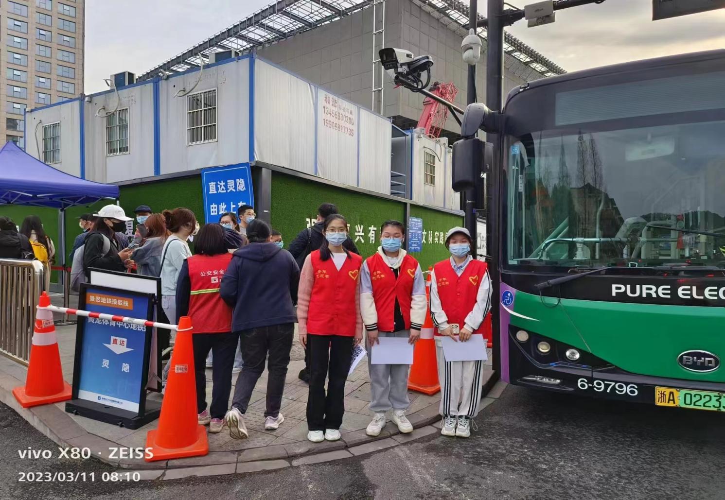 信管221班陈寒娟说“我在灵隐寺车站和太子湾车站做了两次志愿者,印象最深的是遇到了三位聋哑人,如果他们顺利刷卡通过,我们也许不会有什么交流,然而那张卡不能用于这辆灵隐寺的专车上。正当我用打字难以向他们解释清楚时,车站负责人姐姐对我说,让他们直接过去坐车吧,没关系的。看他们微微低头感谢,笑着走过去,虽然并不是直接因为我的帮助,我依然觉得非常有成就感,下周我还要继续来做志愿服务。”