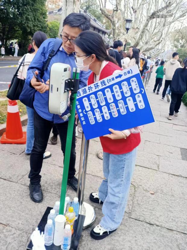 图为白堤志愿者为旅客详细介绍路线