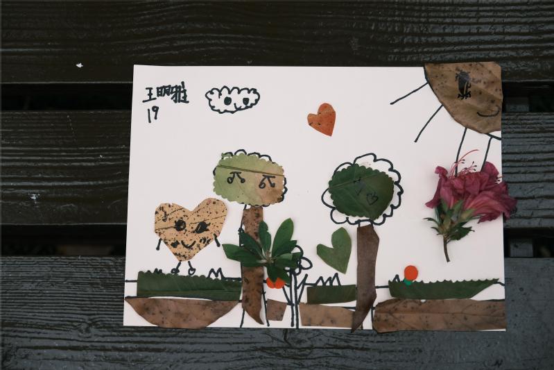 活动第三项——制作落叶绘本,小朋友们在纸上用落叶和黏土对《长呀长》的线稿进行填色,填色完成的小朋友可以凭此去和志愿者换取奖品并将其带走留作纪念。小朋友们都踊跃地参与了进来,他们积极思考,大胆创新,细致涂色,陆续创造出了许多精美的画作。
