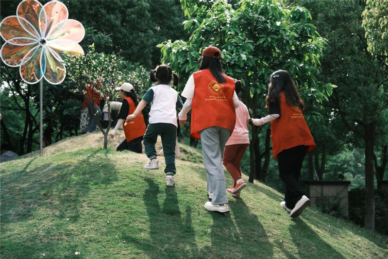 活动第二项——捡落叶,志愿者将小朋友们分成五组,引导各组组长承担领队的责任,迅速把其他小朋友带到指定场所,在确保小朋友的安全下进行此项活动。落叶繁多而杂乱,小朋友们穿梭在场地间,兴致勃勃地积攒形状优美的落叶,为制作绘画做准备。