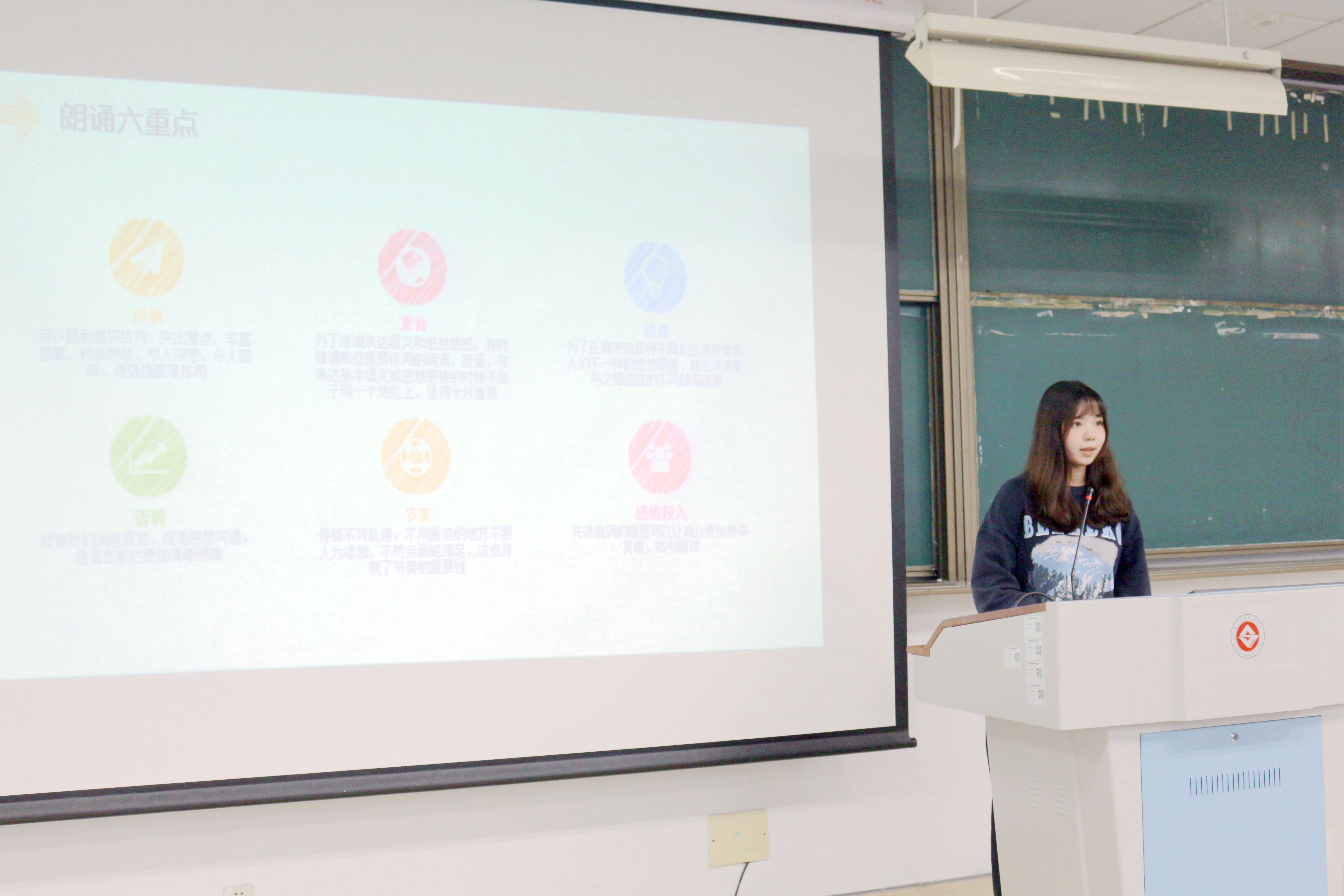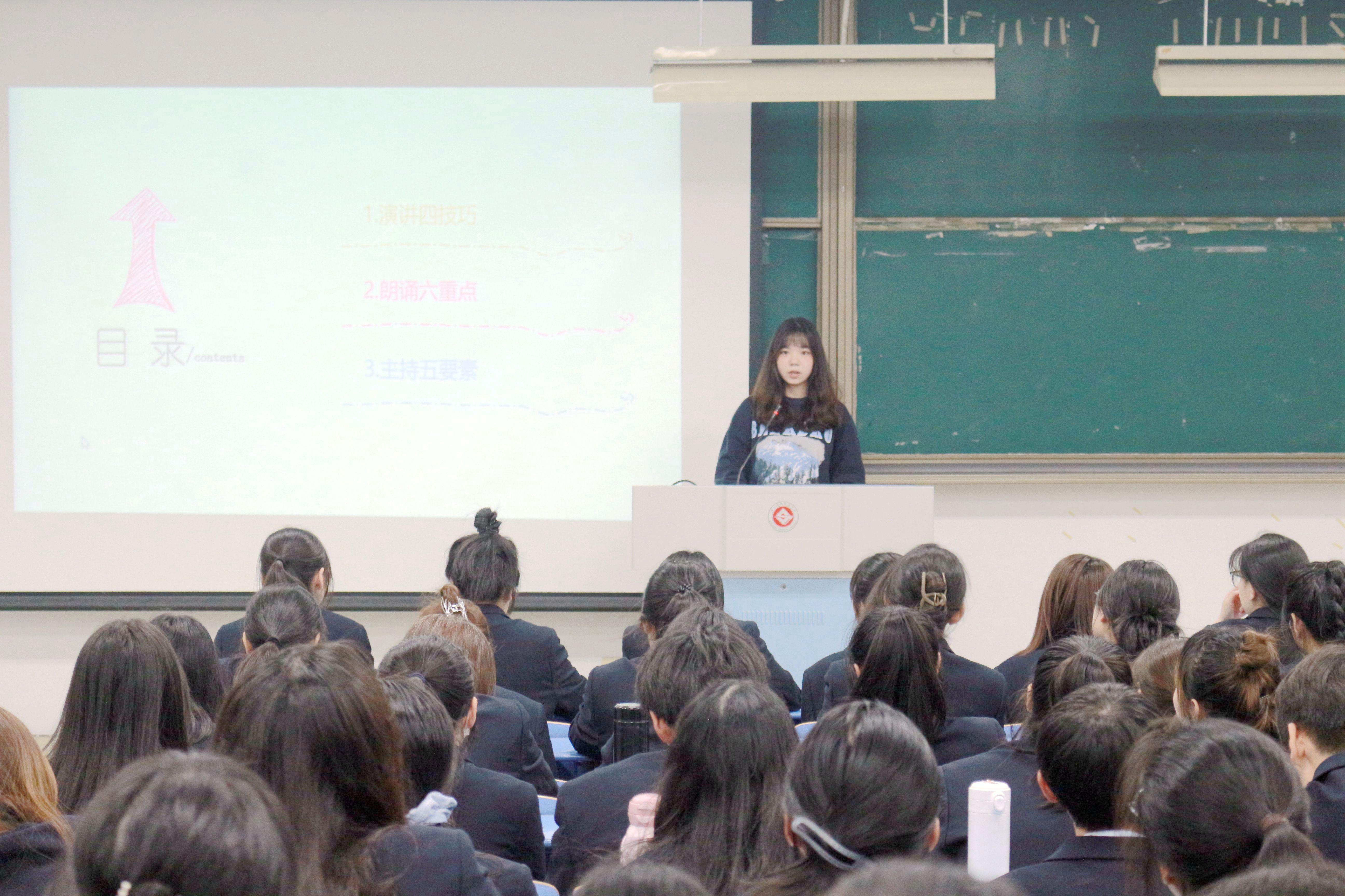 蒋雨桐从三个方面对银雁班成员进行培训:一、演讲四技巧:仪容一定要到位,注意面部表情,演讲姿势有讲究,要有一定的手势;二、朗诵六重点:停顿、重音、语速、语调、节奏、感情投入;三、主持五要素:知道活动的性质,了解和掌握流程,穿着得体,熟悉台词,树立自信。