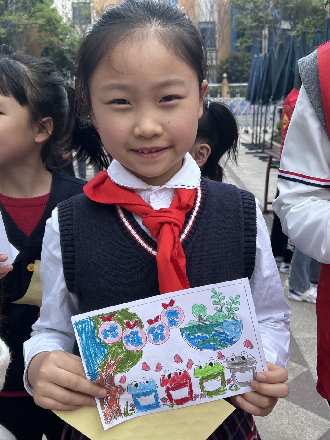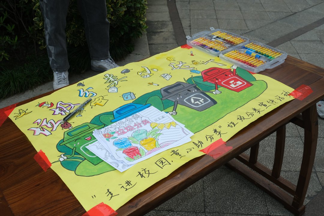 第二个环节是让同学们在纸上用蜡笔对垃圾分类海报的线稿进行填色,填色完成的同学可以凭此去和志愿者换取小礼物并将其带走留作纪念。同学们都踊跃地参与了进来,他们积极思考,大胆创新,认真涂色,陆续出现了许多精美的画作。