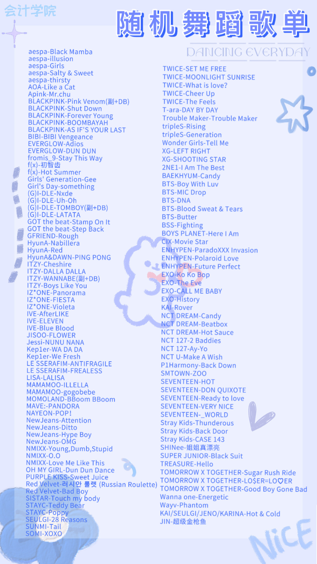 为丰富学生课余生活,增强大学生身体健康,培养积极向上的运动精神,并提供给同学们一个展现自身才华的舞台,会计学院将于4月14日18:00在华夏运动场(雨天改为排球场)举办随机舞蹈活动,本次活动由会计学院文体部主办。