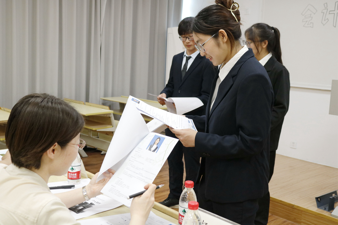 本次模拟面试分为递交简历、自我介绍、面试官提问三个环节进行。面试开始,同学们衣着正装,有序进入面试场地,充分显示了他们对本次模拟面试的重视。接着,每位同学结合自己的学习经历、技能、实践等方面,向面试官进行自我介绍。财会学子条理清晰、落落大方,进行了充分地自我实力展示,努力向面试官展示出自己最好的一面。