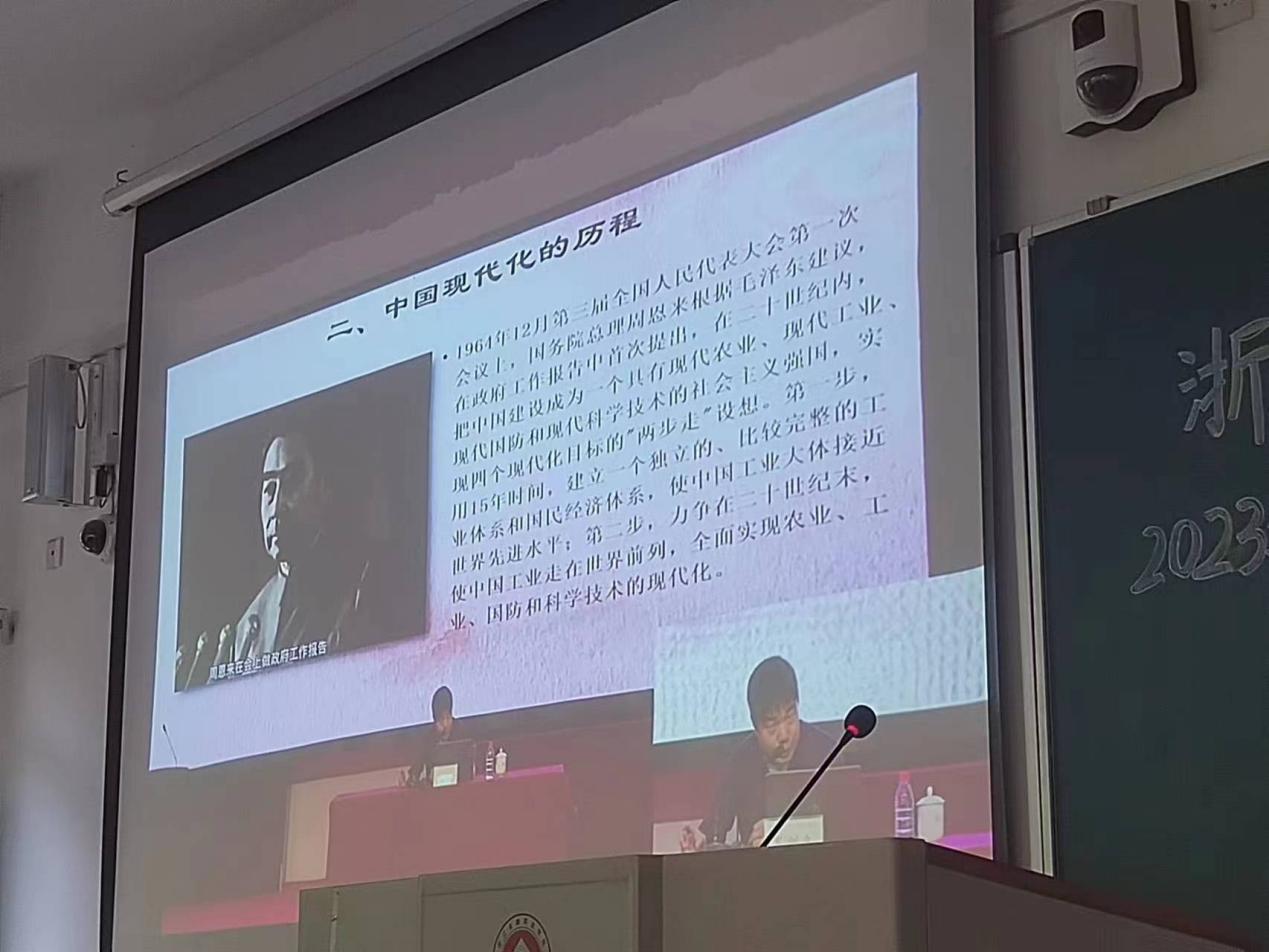 紧接着,肖教授围绕“以中国现代化推进中华民族伟大复兴”这一主题展开党课。他首先向我们举例讲解中国现代化的工具,讲述了中国共产党对中国现代化的百年探索,在国际比较中历史性地创造了人类文明新形态拓展,拓展了发展中国家走向现代化的途径和选择,并指出了中国现代化与中华民族实现伟大复兴两者间的关系,中国实现了现代化,建设了新时代强国,也就实现了中华民族的伟大复兴。最后肖教授对本次党课做出总结,党的建设要全面从严,党建要切实落实化。