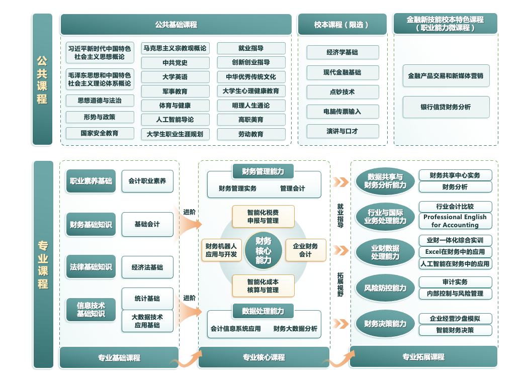 基础会计、企业财务会计、审计实务、智能化税费申报与管理、智能化成本核算与管理、财务管理实务、会计信息系统应用、管理会计、财务机器人应用与开发、财务大数据分析等。