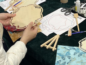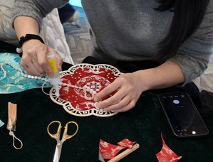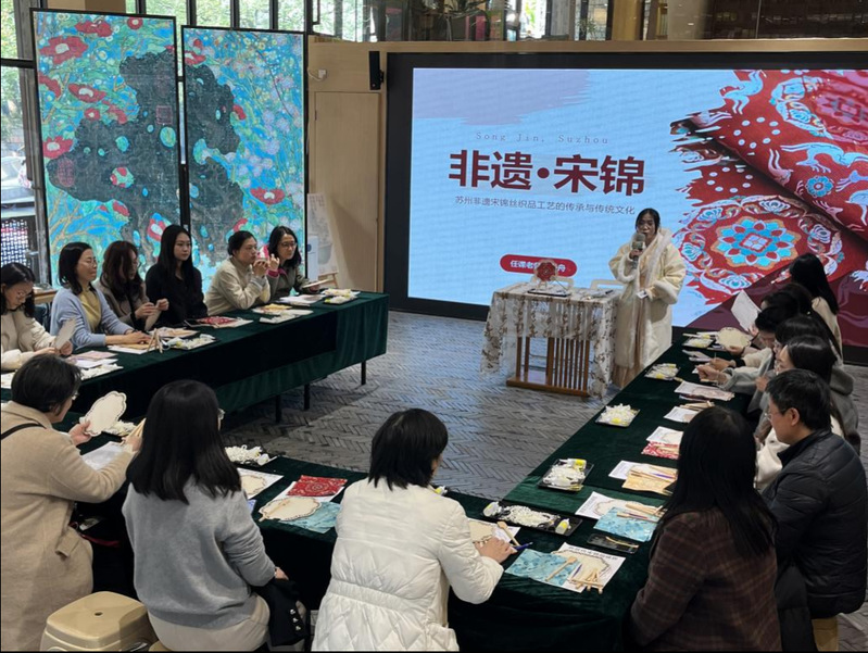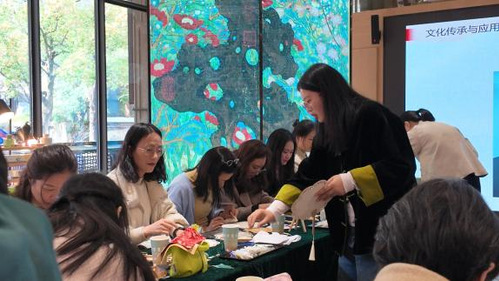 活动伊始,女教师们缓步参观书房景致,在宋代市井音律的萦绕下漫步,于移步换景间开启宋韵文化之旅。随后,宋锦珍珠扇手作体验温情启幕。手作老师围绕南宋美学、宋锦文化、宋锦扇展开讲解,细致解读了宋韵文化背后的精神内涵。讲解结束后,老师先进行现场示范,耐心讲解宋锦珍珠扇的制作步骤、技巧和注意事项,在老师的专业指导下,大家迅速投入创作,挑选珍珠配饰,小心翼翼点缀,在指尖的灵动操作中,将宋韵雅致与个人巧思完美融合。制作过程中大家相互交流、彼此协助,现场氛围温馨而融洽。经过沉浸式创作,一把把独具特色、雅致精美的宋锦珍珠扇陆续完成,每一件作品都彰显着女教师们的审美与匠心,泛着温润的光泽与古典的韵味。